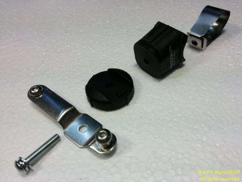 - Insert the bolt through the steel bracket and the holes of the plastic cover and plastic base and engage the threads at the end of the bolt with the threads of the nut embedded in the strap.